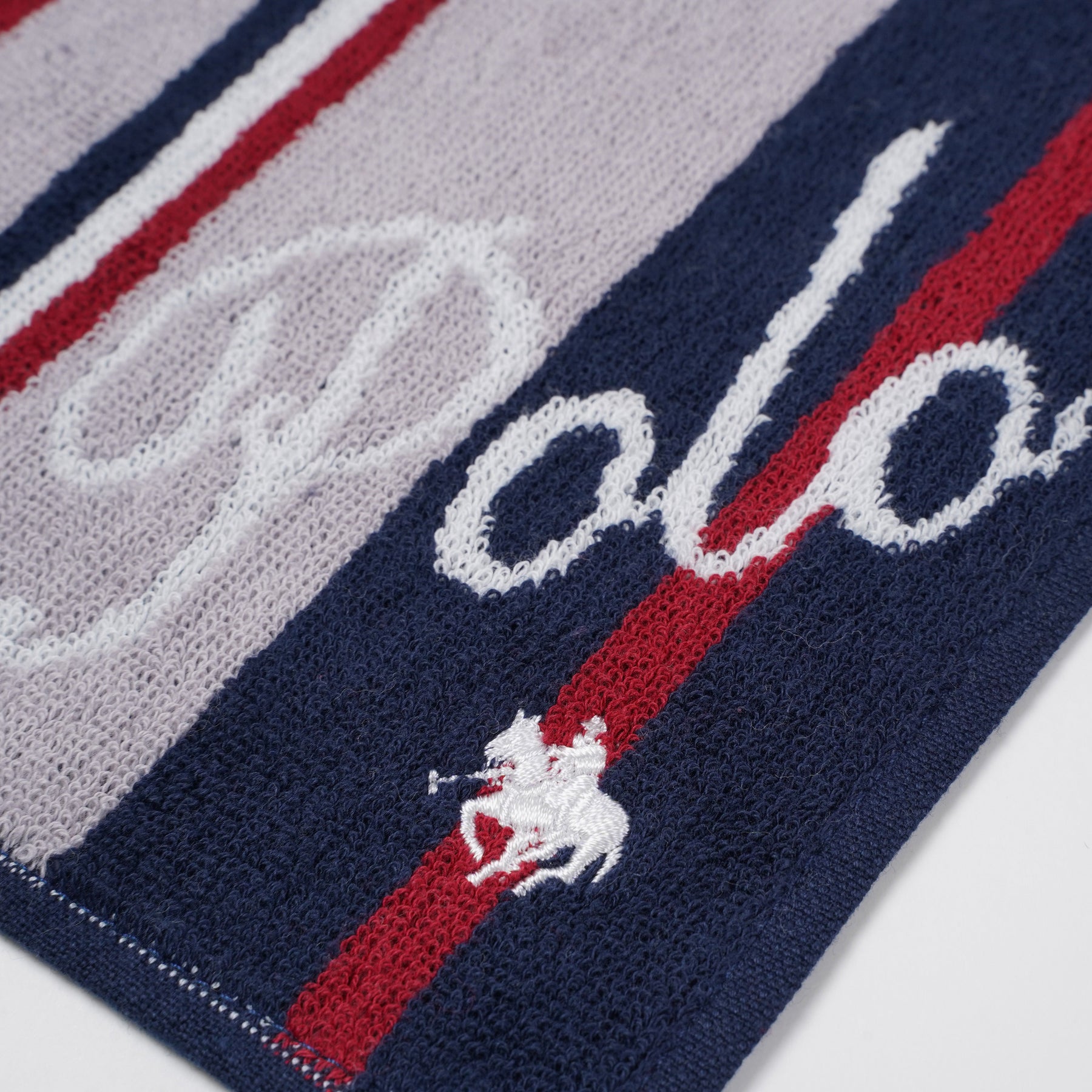 スタイリッシュなストライプ柄と「Polo」の筆記体ロゴがアクセントになるタオルハンカチ。